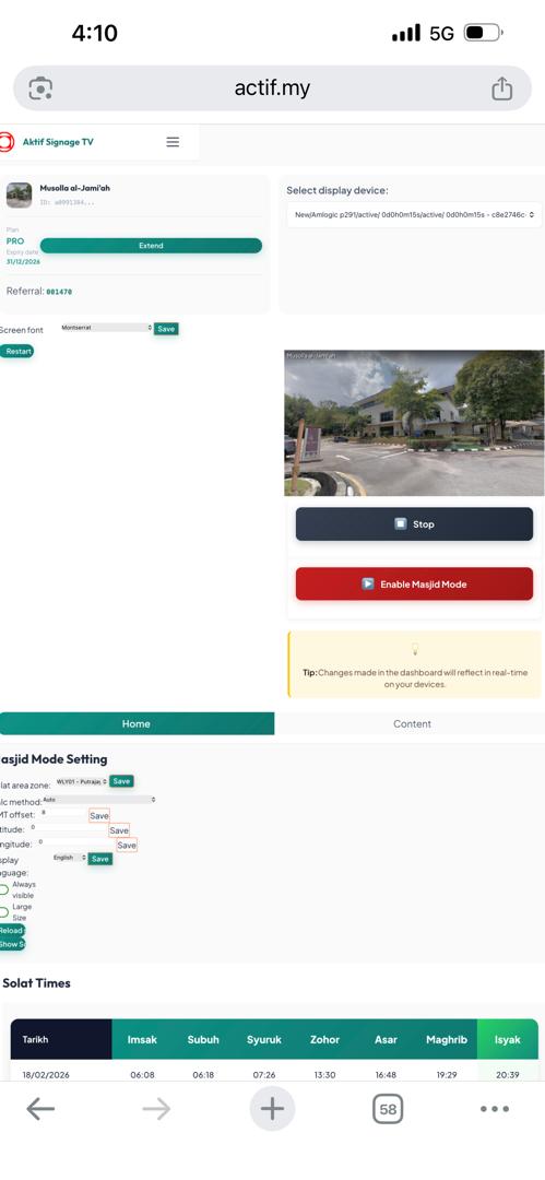 - Klik Enable Masjid Mode untuk operasi masjid